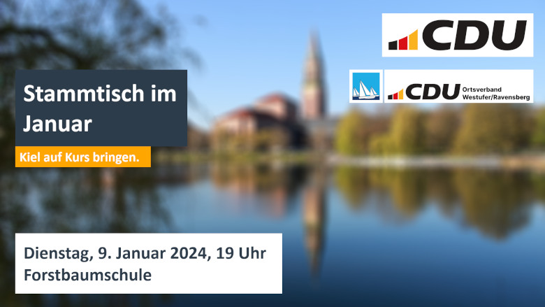 neues Jahr, neuer Stammtisch – ein spannendes politisches Jahr steht uns bevor und es gibt viel zu diskutieren. In Schleswig-Holstein steht der Europawahlkampf vor der Tür, für den unser Europaabgeordneter Niclas Herbst für die CDU erneut ins Rennen geht. Ebenso werden wir als CDU Kiel voraussichtlich in diesem Jahr uns personell für die Bundestagswahl 2025 und die kommende OB-Wahl aufstellen. Ebenso werden wir die inhaltlichen Debatten aus dem Mitgliederkongress und dem Kreisverbandsausschuss über die Kieler Kommunalpolitik weiterführen.