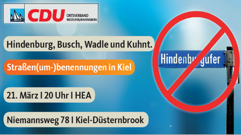 Daher ist es mir eine Freude, Sie zu unserer Veranstaltung „Hindenburg, Busch, Wadle und Kuhnt - Straßen(um-)benennungen in Kiel“ einladen zu dürfen. Als Redner konnten wir unseren CDU-Landtagskandidaten Robert Vollborn und den Kieler Historiker Dr. Jan Schlürmann gewinnen.