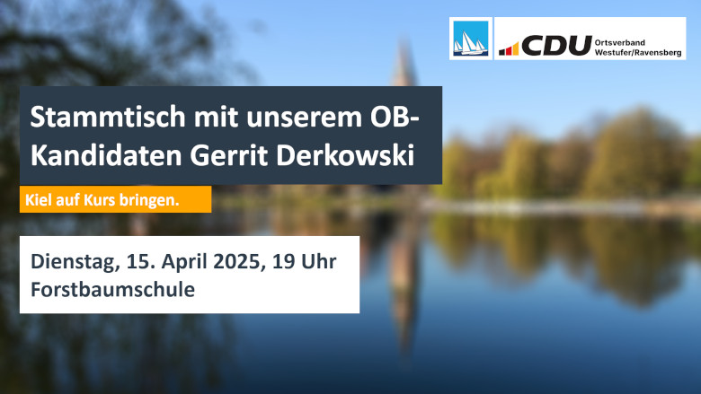 Wer für uns als CDU in den Wahlkampf ziehen wird, ist nun kein Geheimnis mehr. Mit Gerrit Derkowski hat der Kreisvorstand der CDU Kiel einstimmig einen bekannten Kieler nominiert, mit dem wir das Rathaus erobern wollen. Damit alle in unserem Ortsverband sich ein Bild von unserer Wahl zur Wahl machen können, haben wir bei unserem nächsten Stammtisch Besuch und laden herzlich ein zum