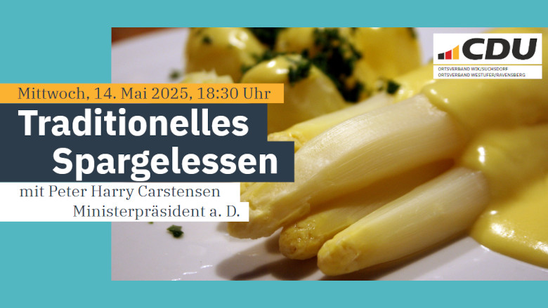 Bitte melden Sie sich spätestens bis zum 7. Mai an (lewe.jannsen [at] cdu-kiel.de / 0157 52580945); die Teilnahmebestätigung erfolgt nach Anmeldereihenfolge. Der Preis für Spargel satt beträgt: 30,90 €.